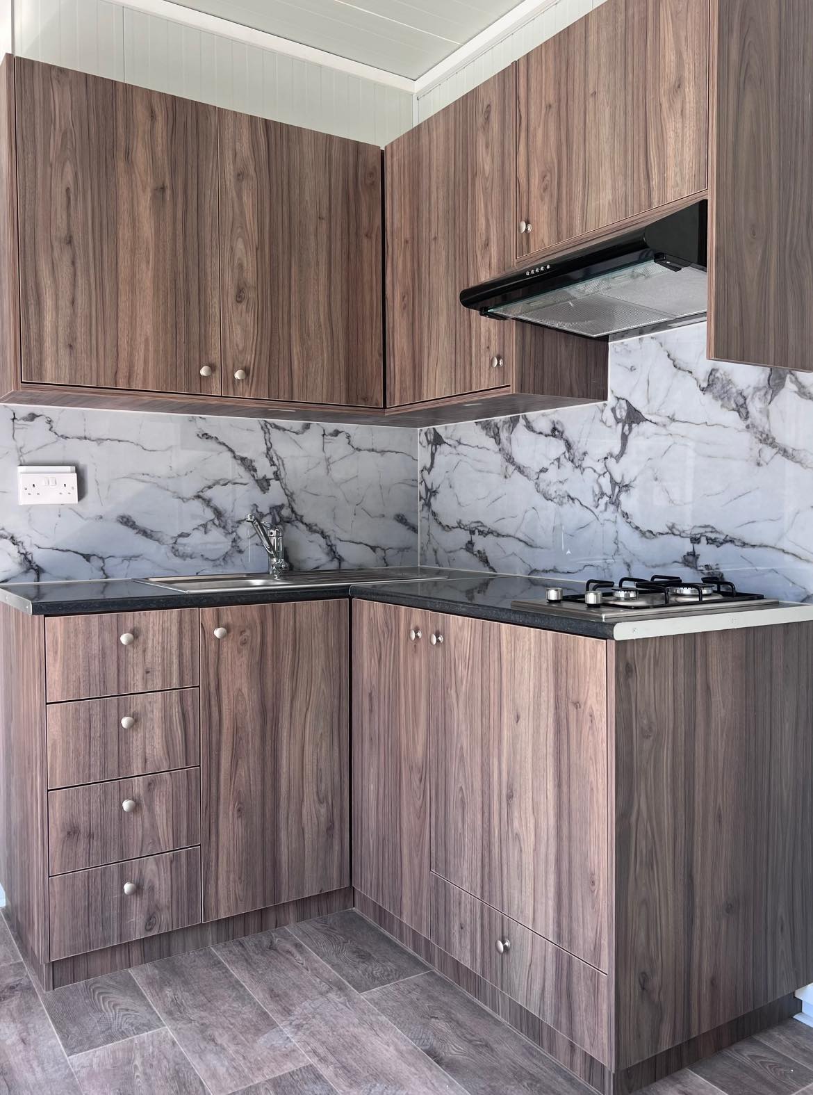 Pieces of stainless steel to protect the mini-kitchen from the spoilt water, perimetric from the sink in height of 31 cm.