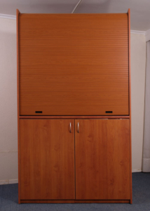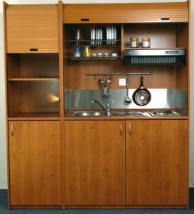 A roll top which is pulled down and hides everything behind making the mini-kitchen wonderful, invisible and capable to be located in any place.