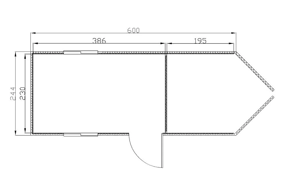 M – 20C – P25 – OF – ST Modified 20ft container. Office with store, insulated with 25mm polyurethane panels, electrical installation, PVC floor and aluminum doors and windows.