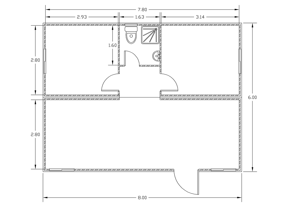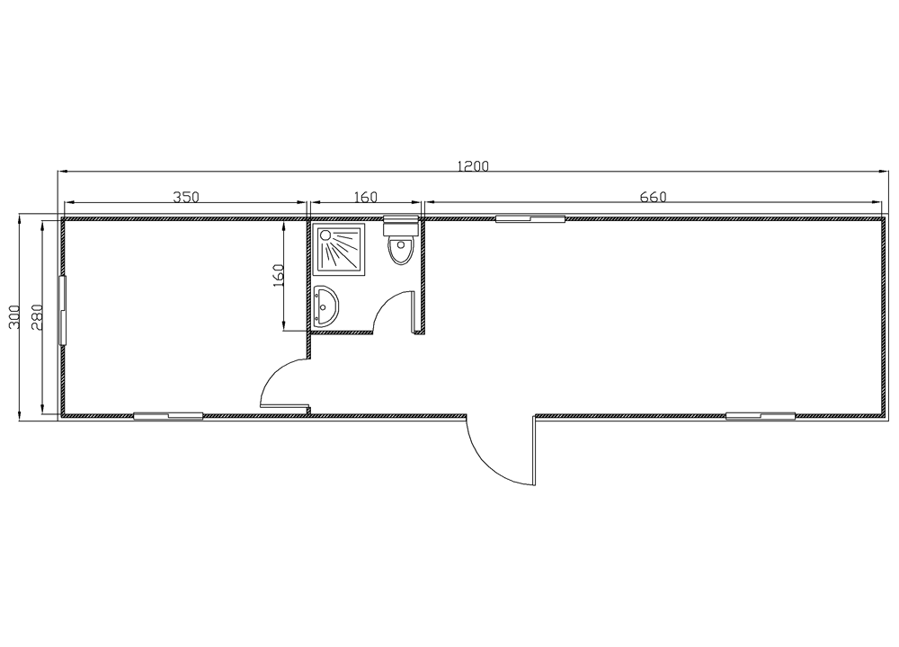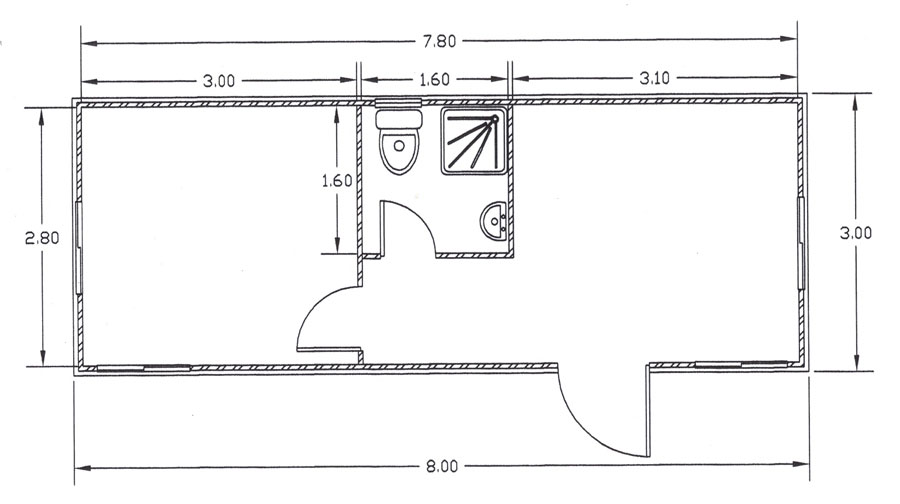 8x3m – T – S Prefabricated module 8 X 3 meters. With toilet, hand-wash basin, shower. Electrical installation and aluminium doors and windows.