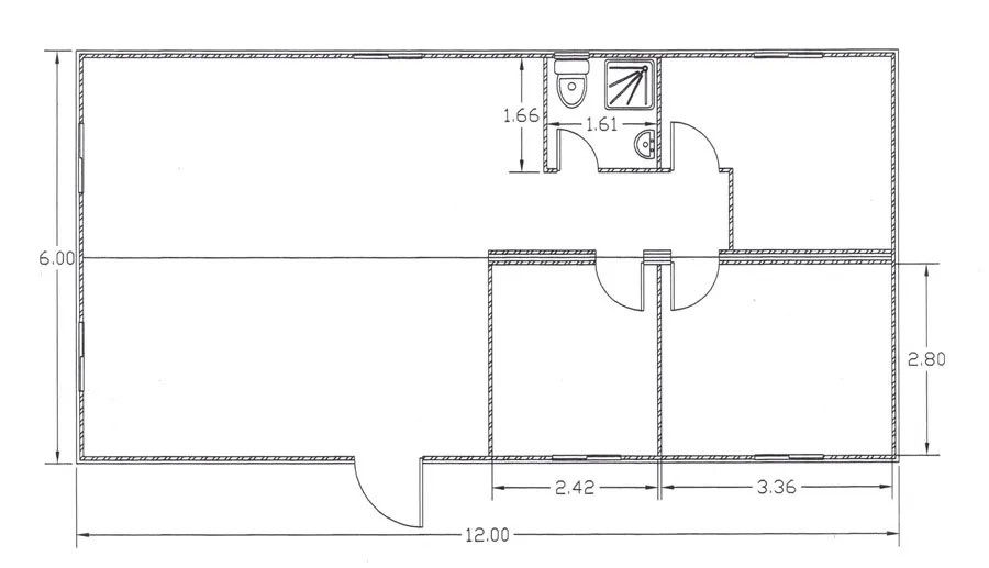 2x3m – T – S – 2 Bedroom Prefabricated module 12 X 3 meters. With 2 bedrooms, toilet, hand-wash basin, shower. Electrical installation and aluminium doors and windows.