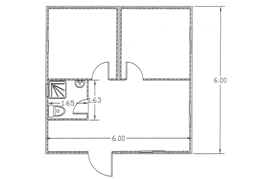 6x6m – T – S Prefabricated house 6 X 6 meters. With 2 bedrooms, toilet, hand-wash basin, shower. Electrical installation and aluminium doors and windows.